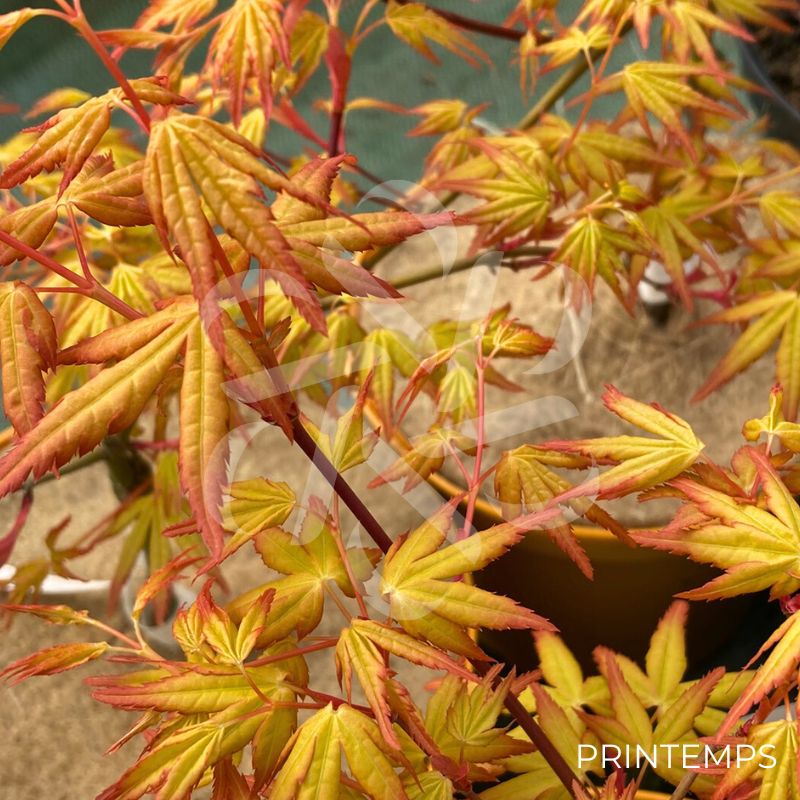 Les petites feuilles de cet Érable du Japon émergent au printemps avec un jaune clair rosâtre très original, avant de devenir un jaune/vert doré en été qui garde la couleur pendant la saison.
