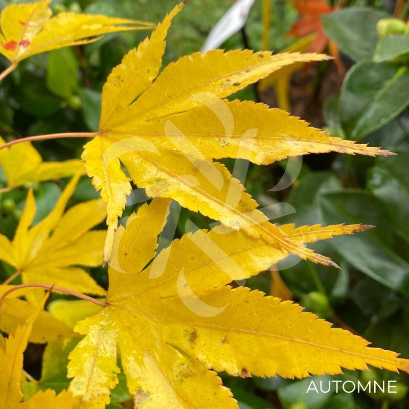 L’Acer palmatum ‘Unebi’ est un cultivar rare avec de grandes feuilles qui au printemps sont d’un vert bronzé brillant, devenant vert moyen pendant l’été, puis prenant une belle couleur jaune-orange à l’automne.