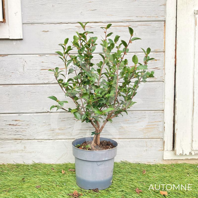 Cet arbuste persistant de taille moyenne présente un port arrondi et harmonieux, orné d’un feuillage dense et brillant d’un vert profond. Ses feuilles, petites et vernissées, forment un contraste raffiné avec ses fleurs légères et élégantes.