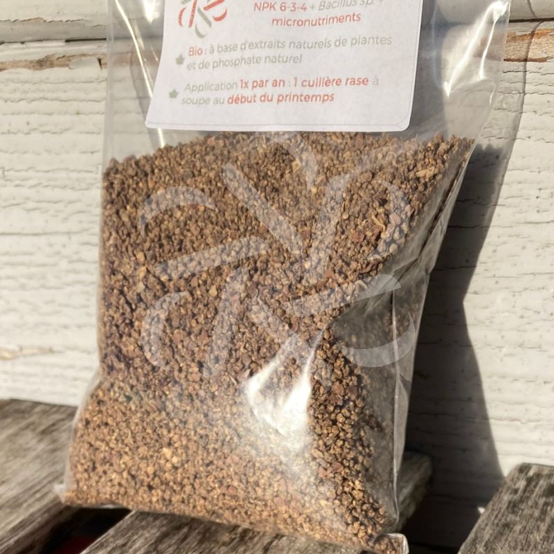 À faible dosage (teneur NPK 6-3-4), cet engrais est aussi enrichi en Bacillus sp., ce qui rend le phosphore et les autres éléments du sol plus assimilable par les plantes.