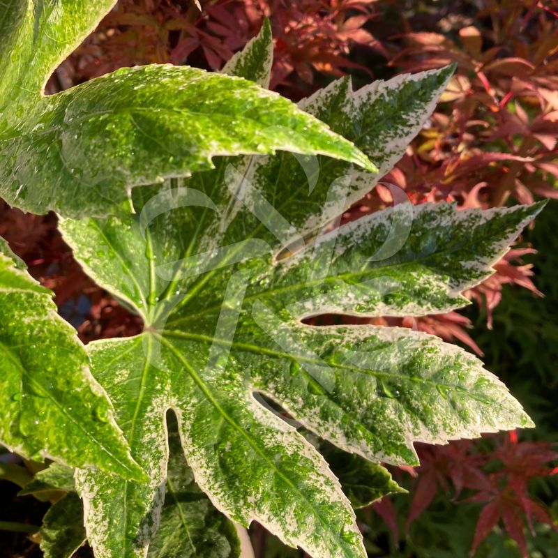 Cette variété, surnommée ‘Spider’s Web’ en raison de l’aspect unique de ses feuilles, se distingue par une coloration marbrée de blanc crémeux qui donne l’impression d’un réseau de toiles d’araignée. Les grandes feuilles en forme de main sont décorées de cette irrégularité blanche, ajoutant une touche spectaculaire à son apparence.