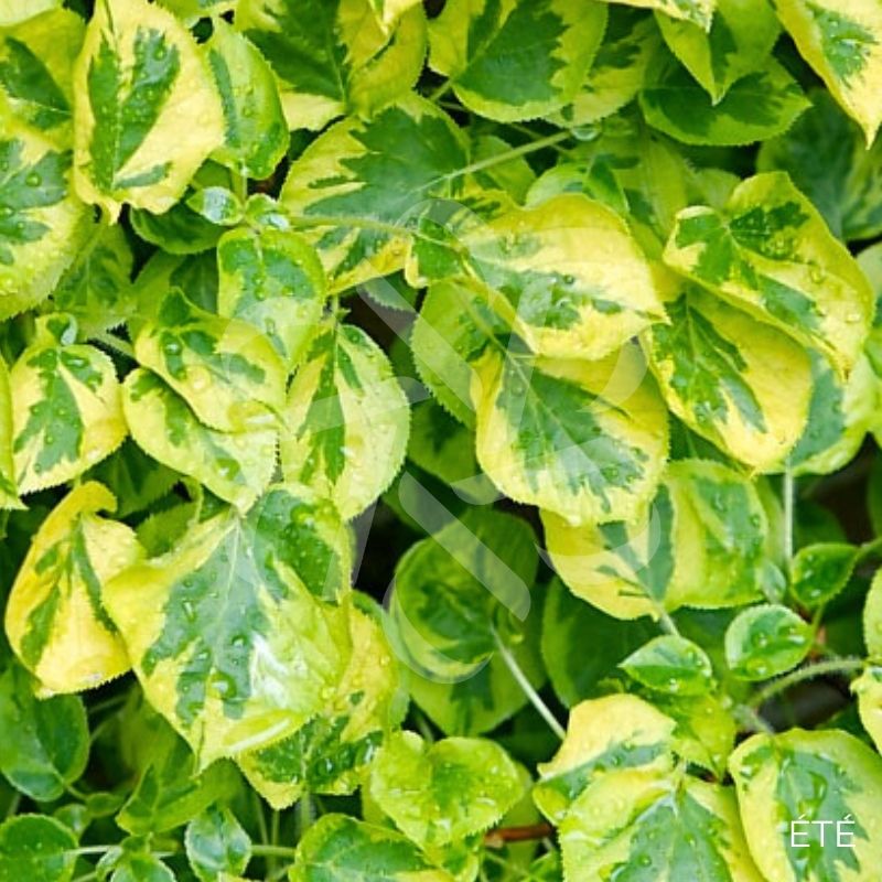 L’hortensia grimpant ‘Mirranda’ est une variété à feuillage panaché vert foncé et vert clair/jaune aux marges et le feuillage est caduc.