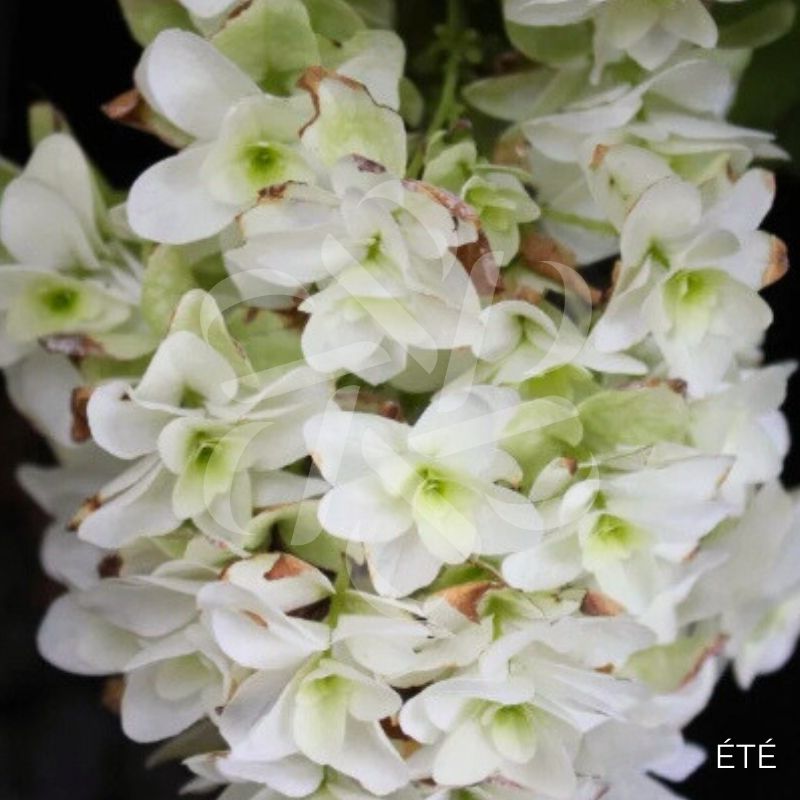 Les panicules coniques ont d’énormes fleurs blanches doubles d’environ 30 cm passant au rose en vieillissant.