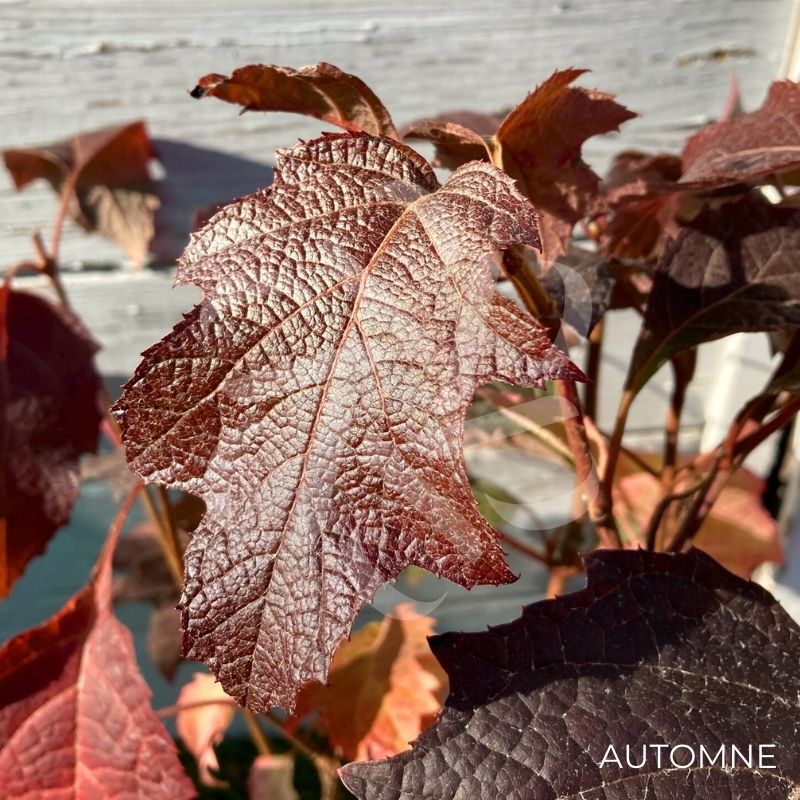 L’Hydrangea quercifolia ‘Snowqueen’ est un hortensia à feuilles de chêne qui prennent une belle coloration rouge brunâtre en automne si elle n’est pas exposée au soleil.