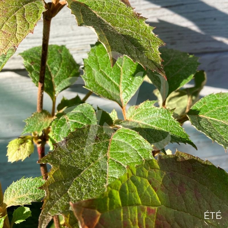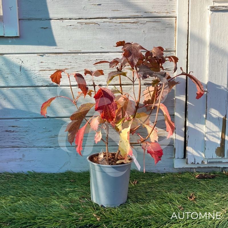 L’Hydrangea quercifolia ‘Snowqueen’ fleurit de juillet à octobre et le feuillage est caduc, prenant de belles couleurs automnales, du rouge bordeaux au rouge orangé.